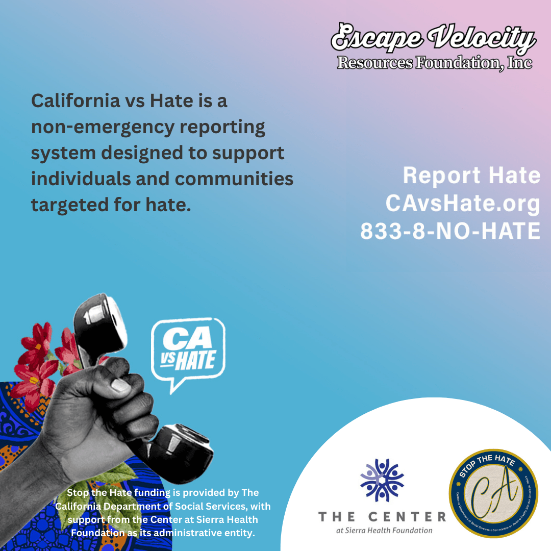 Escape Velocity is a proud recipient of the Stop the Hate Grant to provide support and services to victims and survivors of hate incidents and hate crimes and their families. and facilitate hate incident or hate crime prevention measures. We facilitate hate incident or hate crime prevention measure through our Youth Development programs and intervention measures through community outreach. Stop the Hate funding is provided by The California Department of Social Services, with support from the Center at Sierra Health Foundation as its administrative entity.